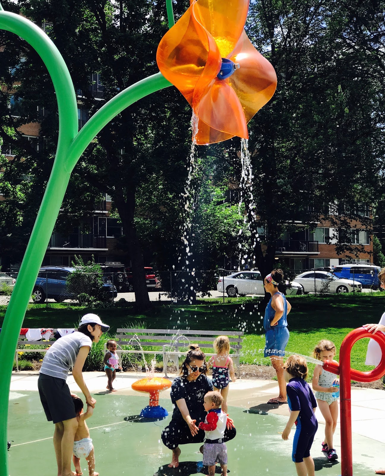 Wodne place zabaw są oczywiście darmowe i korzystać może z nich każdy. Kiedy upał jest niemiłosierny, pod kwiatkiem, który co jakiś czas robi chlup prosto na głowę, ustawiają się również dorośli i to z własnej woli:)