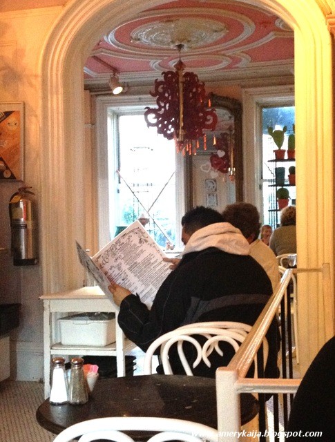 Stolik znajdował się na pierwszym piętrze kawiarni, która ma dwa poziomy. Pan X przewrócił oczami. Doceniam jednak fakt, że zgodził się łaskawie przyjść ze mną do Serendipity. Nie bardzo mu się chciało, ponieważ kiedyś już próbowaliśmy tu wypić kawę, ale nie było wolnych stolików. Już wówczas Pan X stwierdził, że pewnie „to będzie jakaś kicha”. Tym razem jednak mieliśmy szczęście. Nie było tłoku a na dodatek dostaliśmy stolik z filmu! 😉