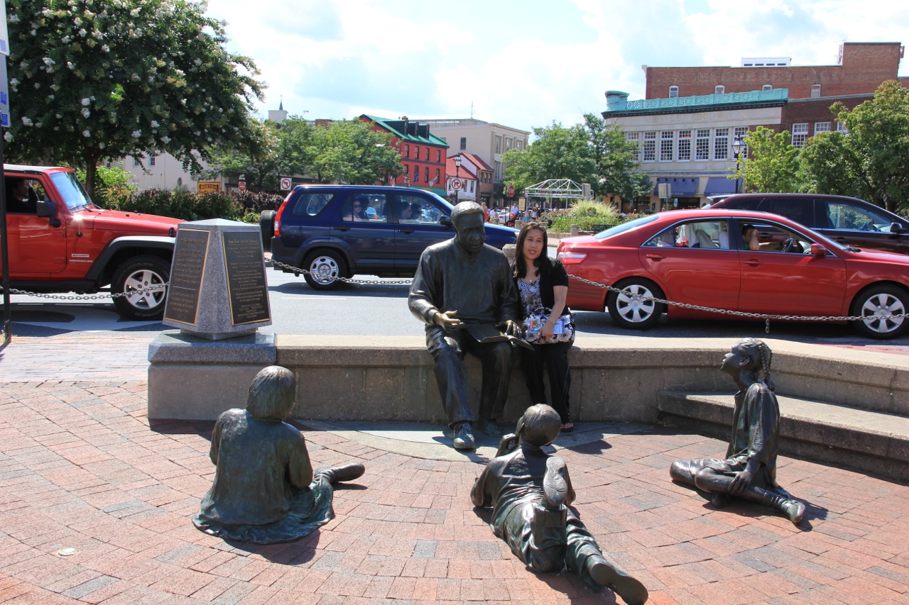 Poniżej pomnik upamiętniający Alexa Haleya, autora Korzeni, powieści o losach Kunta Kinte i jego potomków.